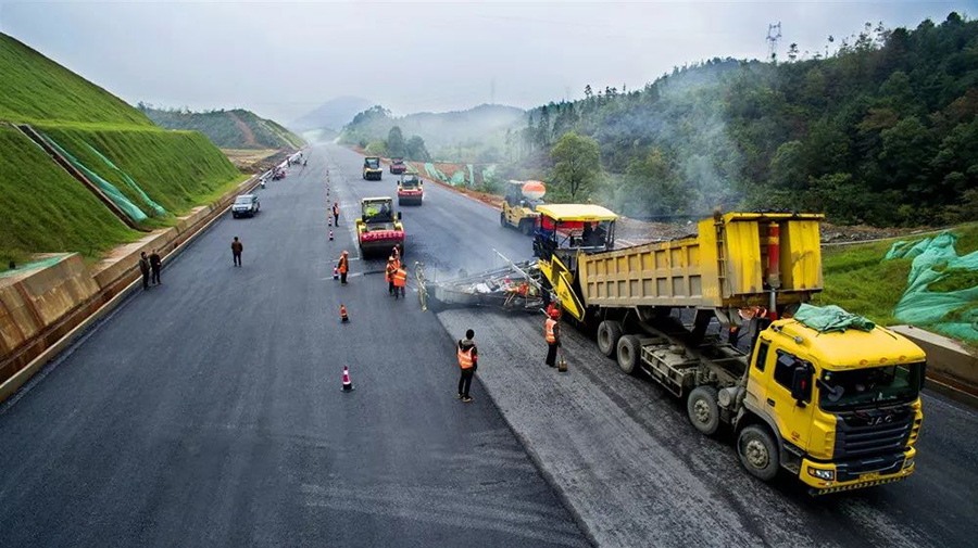 2019年8月,宜春經開區(qū)S311路面攤鋪現(xiàn)場,工友們輔助路面兩側的分料、補窩等作業(yè)